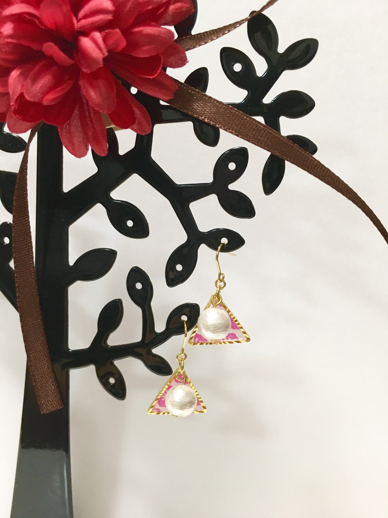 割と小ぶりですが、コットンパールとピンクの花柄がチラチラ見え隠れする大人可愛いピアスです。