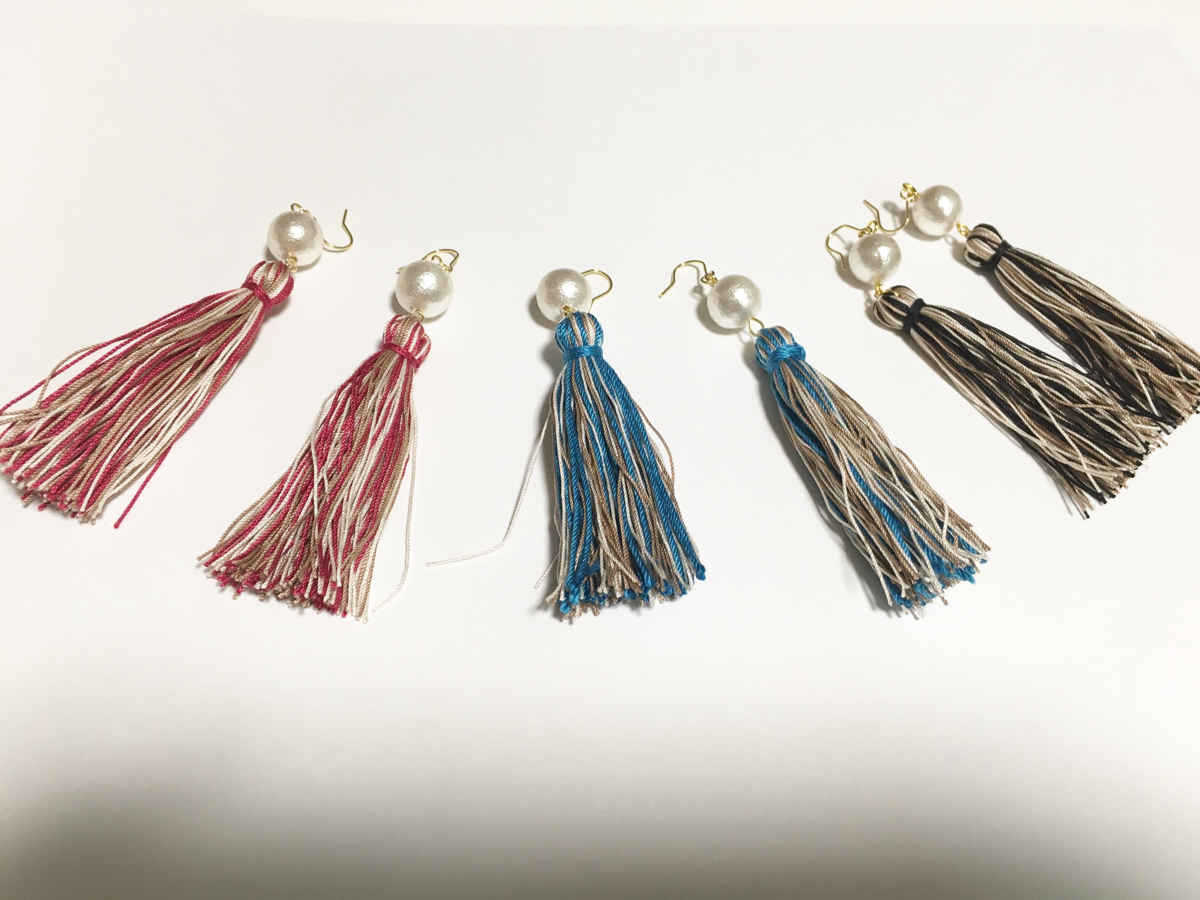 コットンパールとレース糸のカラフルタッセルのピアスです。今季流行りの刺繍ファッションはもちろん、シンプルなファッションにも合わせやすいピアスになっています。